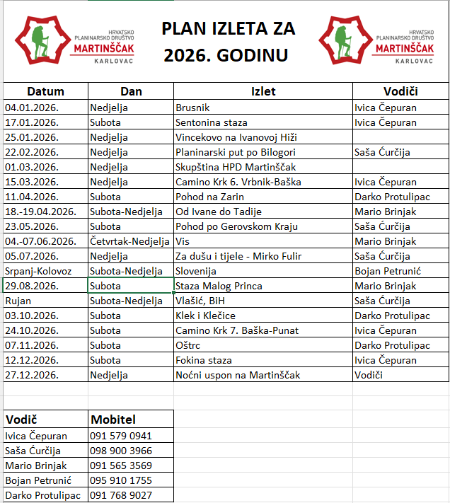 - standardnu izletničko-planinarsku opremu: ruksak, čvrste tenisice, trekking cipele ili slične udobne obuće, vjetrovku, kapu, zaštitu od sunca, fotoaparat